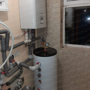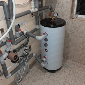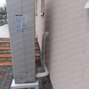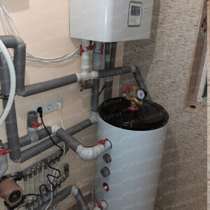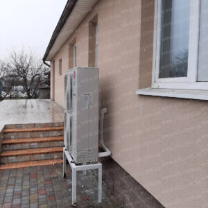 Тепловий насос на об’єкті підключений був до вже існуючої системи опалення електричним котлом. Встановлено компанією СІЛС і бак-накопичувач 100л (холод-тепло). У будинку опалення відбувається теплими підлогами і сталевими радіаторами. Зовнішній блок теплового насоса змонтований на постамент (металеву конструкцію).