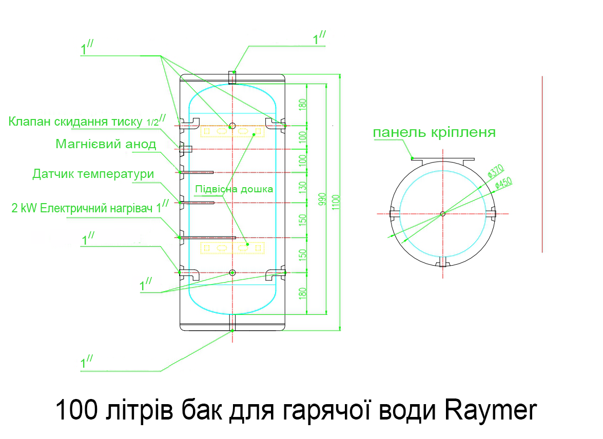 Всі баки Raymer комплектуються вбудованим анодом, комплектом ніжок.