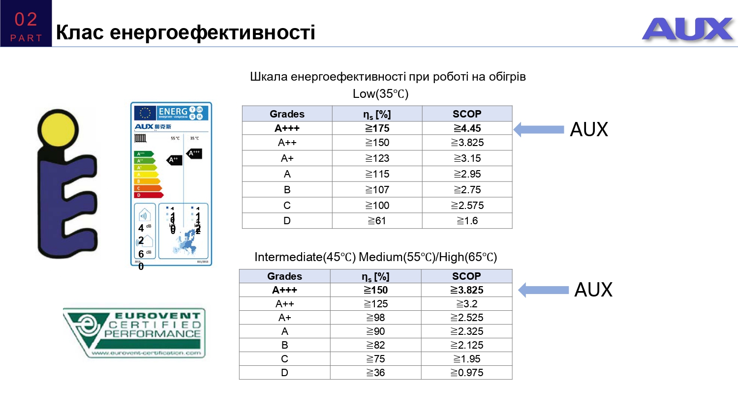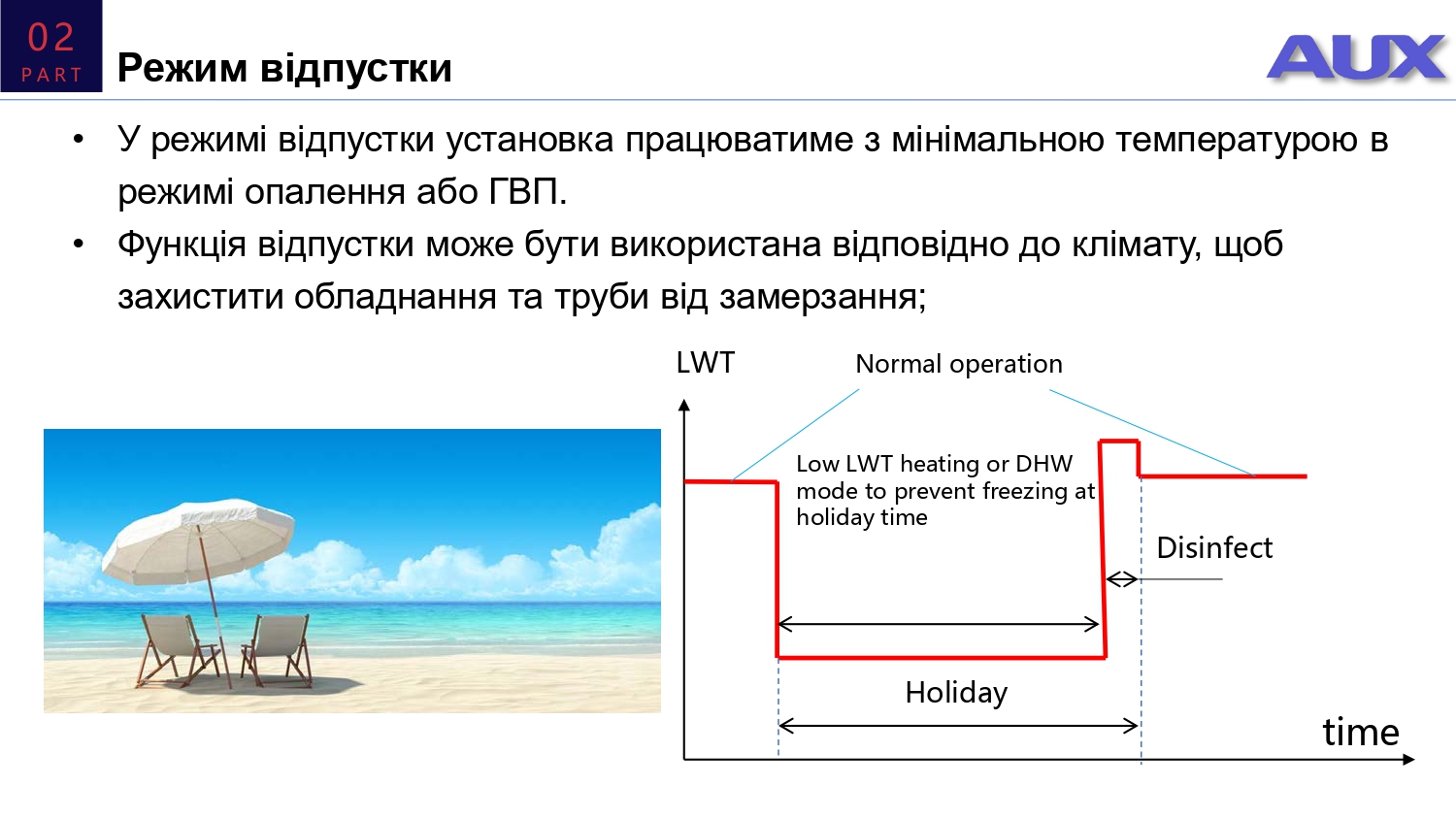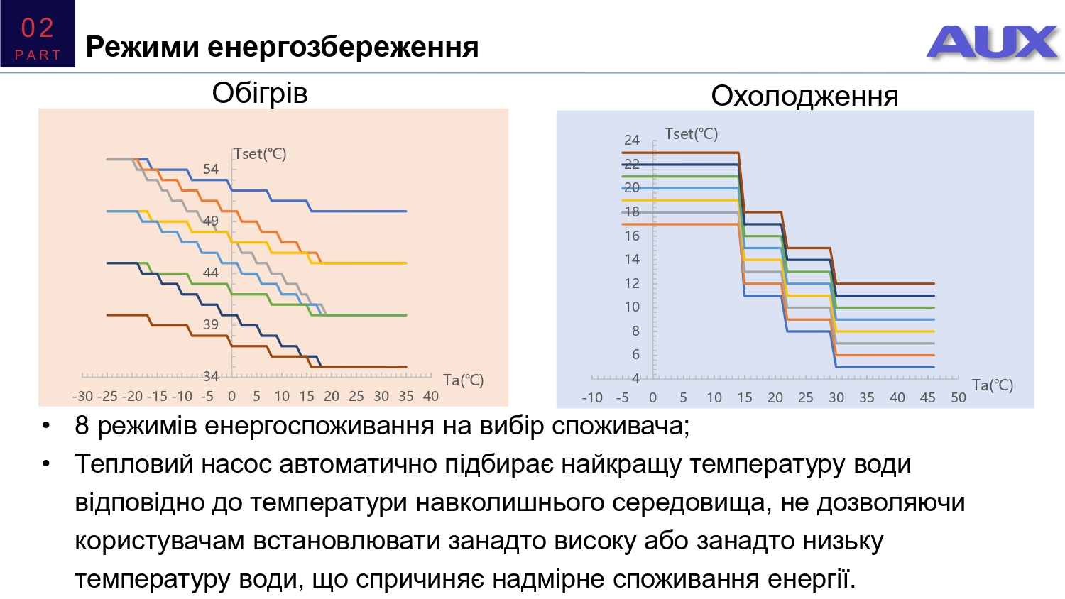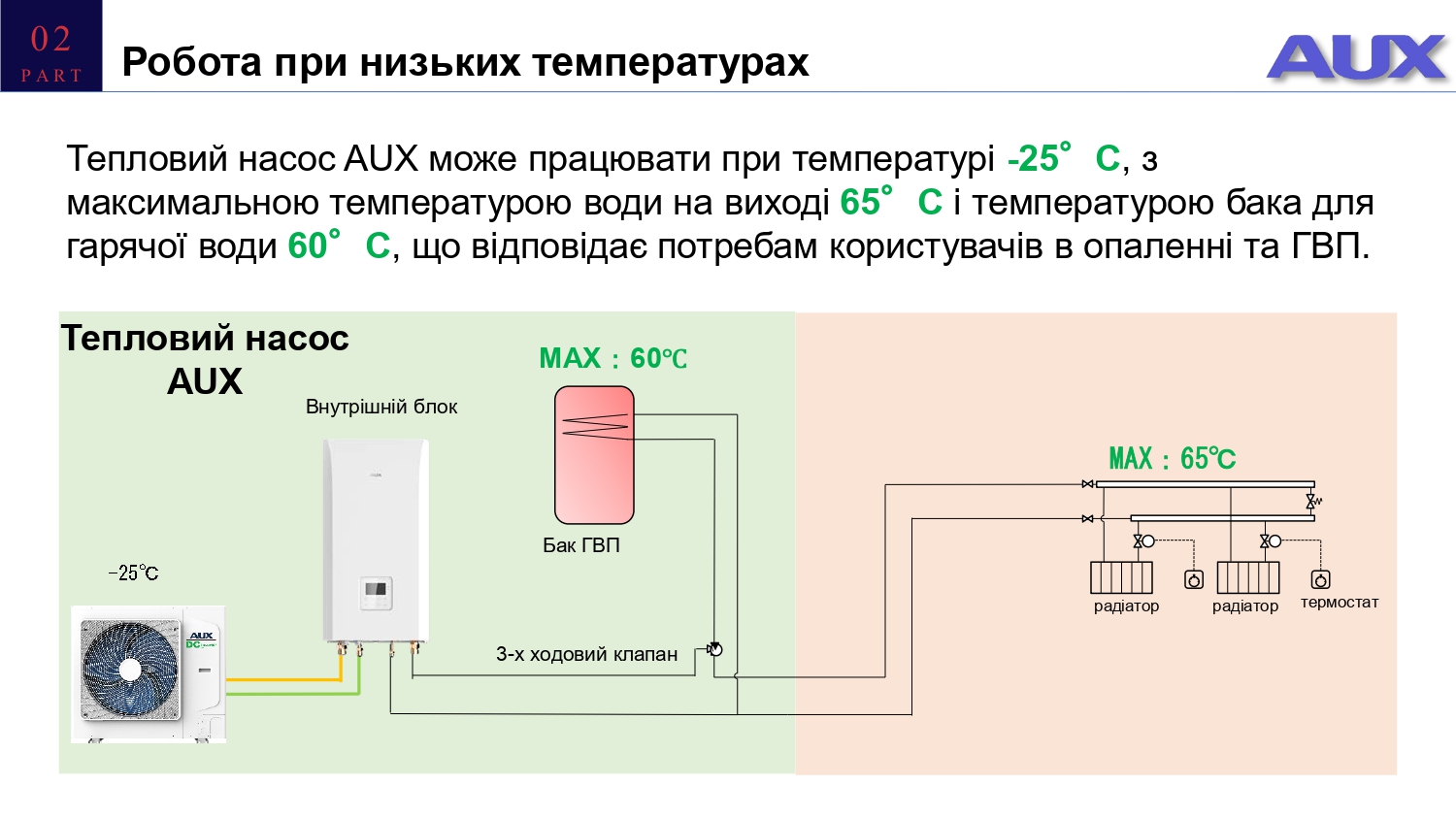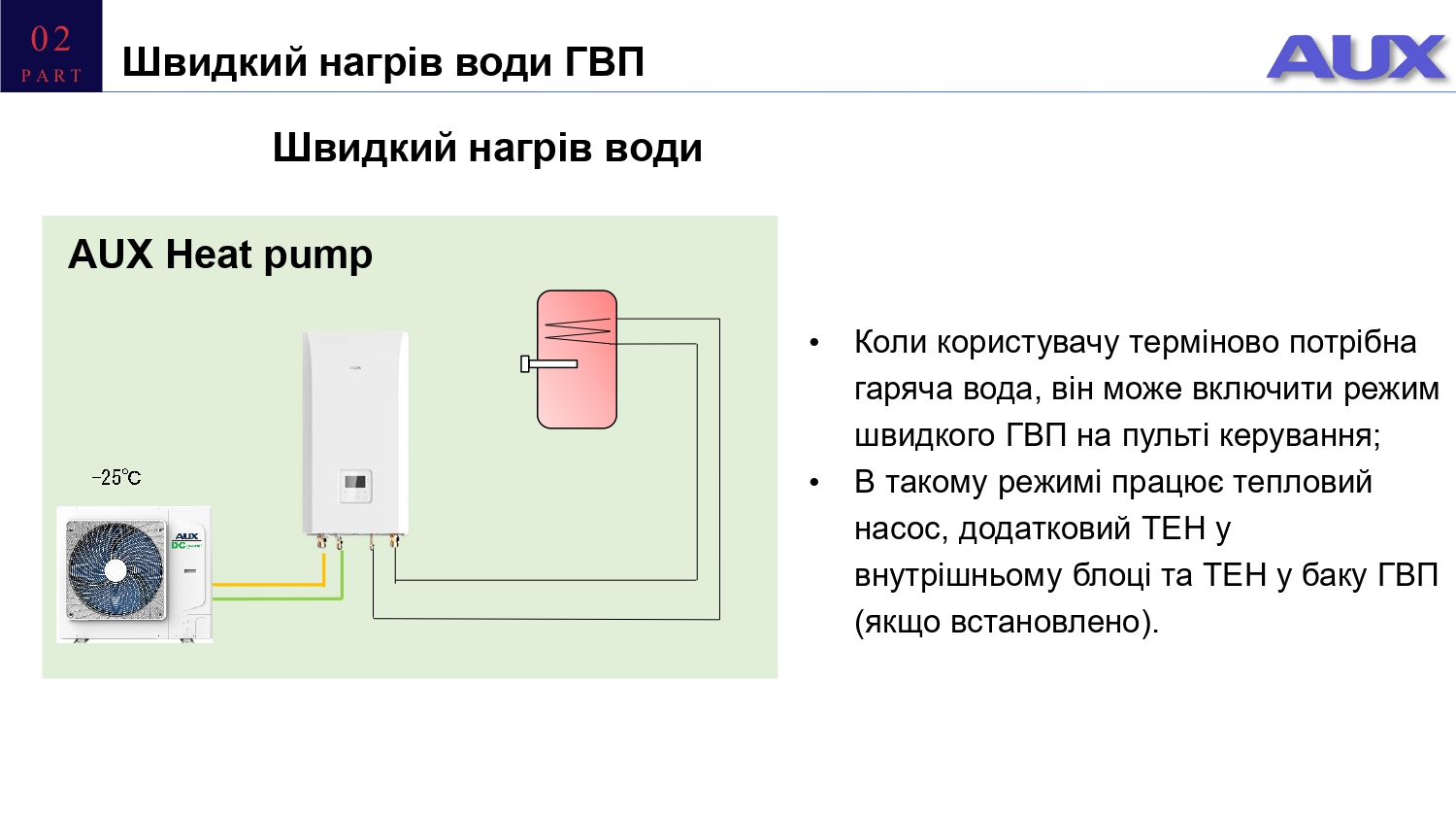 Навіть при температурі зовнішнього повітря -25 ºC тепловий насос AUX може забезпечити воду температурою 44 ºC тільки в режимі теплового насоса без додаткового використання нагрівача, чого цілком достатньо для теМеню російською
