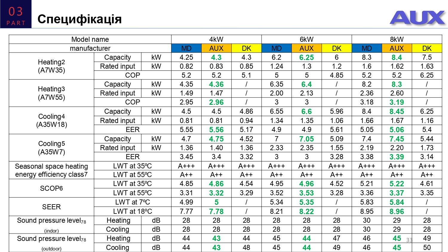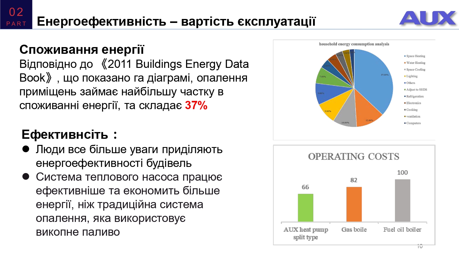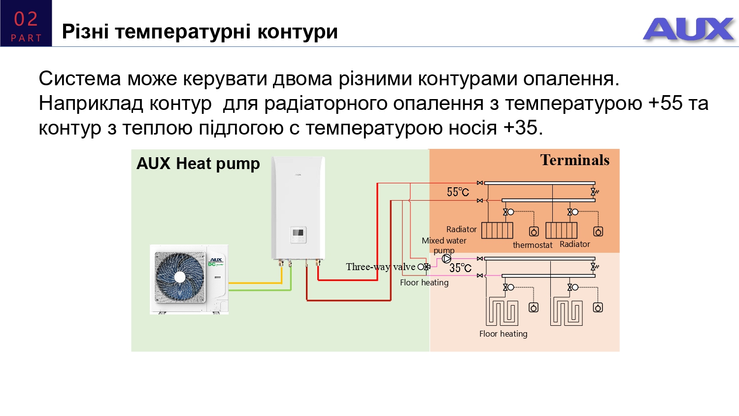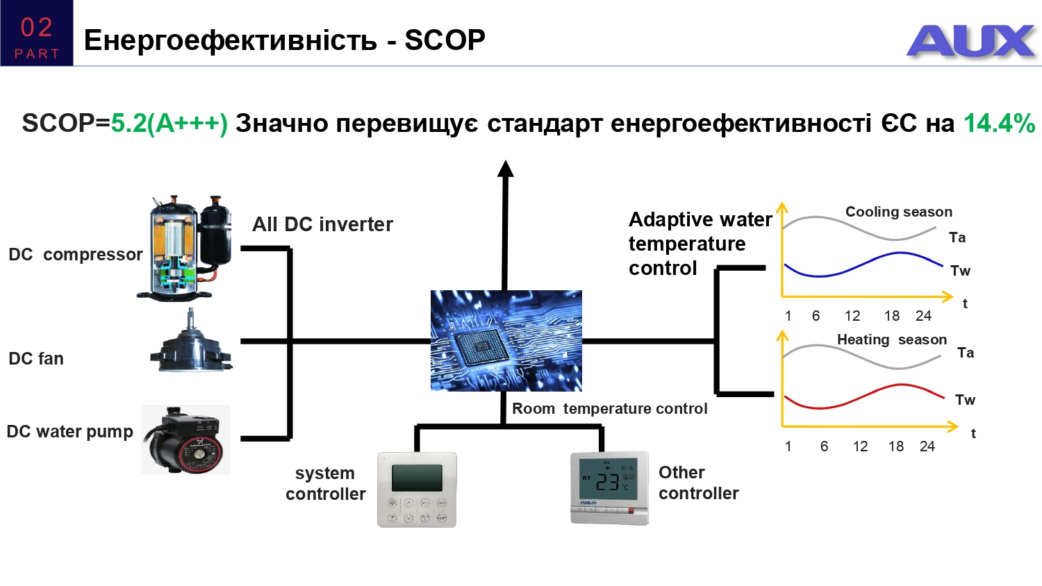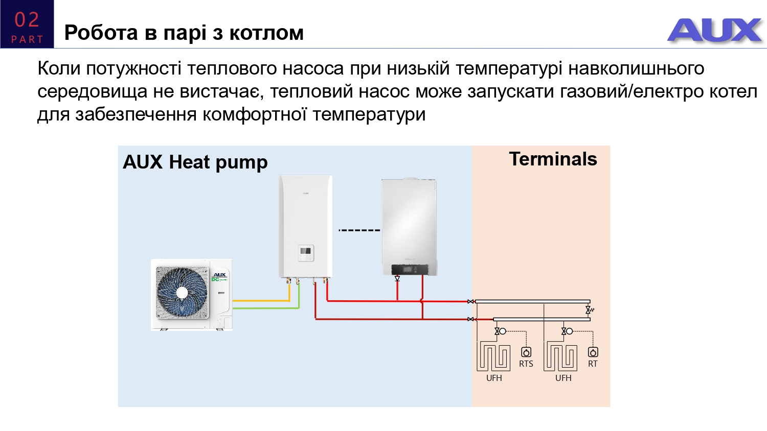 Навіть при температурі зовнішнього повітря -25 ºC тепловий насос AUX може забезпечити воду температурою 44 ºC тільки в режимі теплового насоса без додаткового використання нагрівача, чого цілком достатньо для теМеню російською