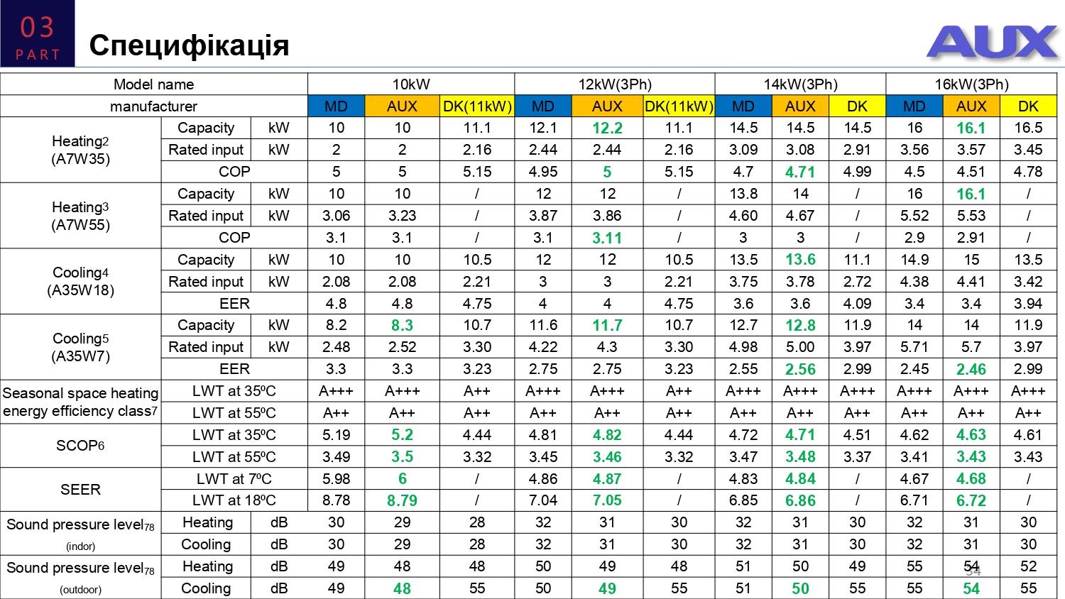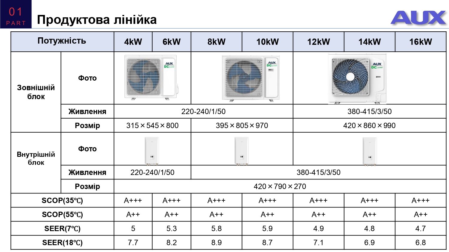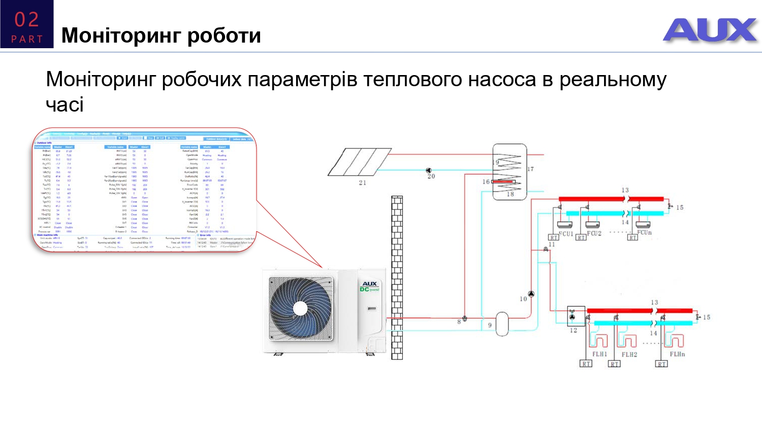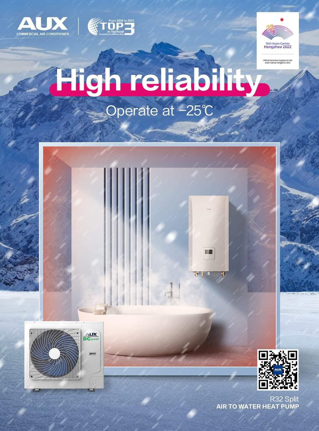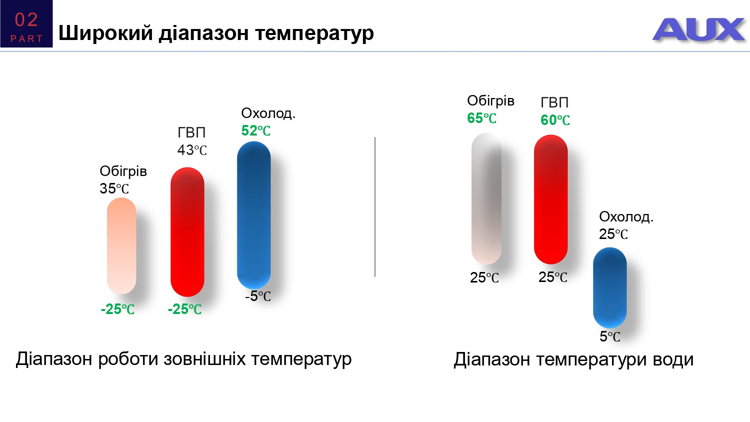 Надійність роботи навіть за екстремальних умов є важливою характеристикою систем теплових насосів AUX. Ви можете розраховувати на стабільну роботу в режимі «Обігрів» за зовнішньої температури навіть -25ºС, а в режимі охолодження до +52ºС, що принесе Вам спокій як у холодні зимові дні, так і в літні спекотні дні.