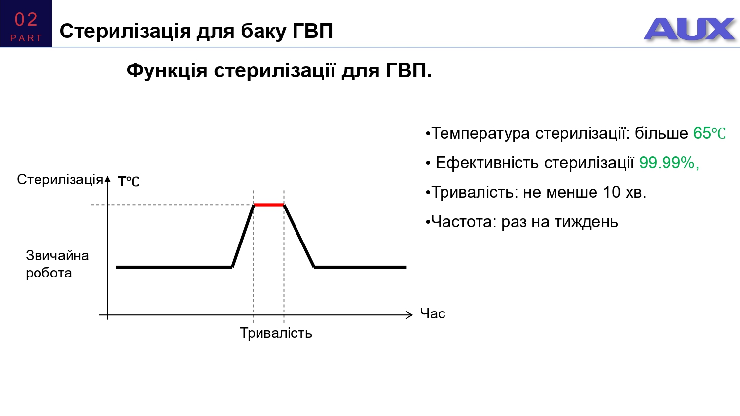 Висока температура стерилізації забезпечує 99% ефективність знищення бактерій легіонел, які можуть розмножуватися в баках ГВП при тривалому невикористанні гарячої води.