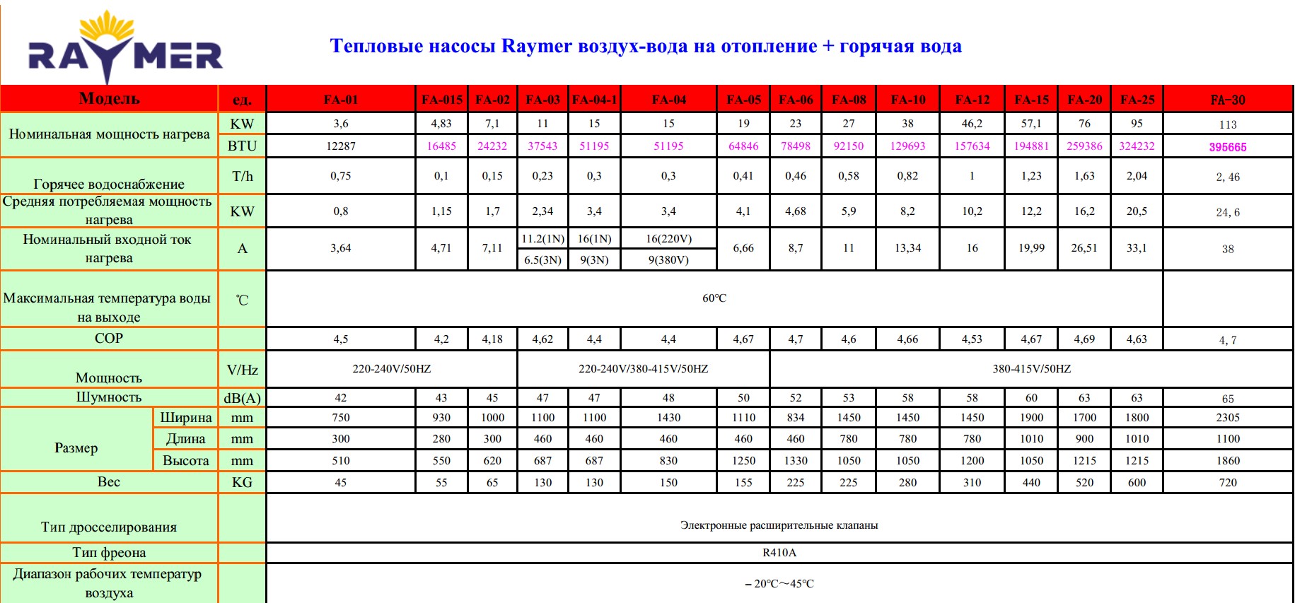 Постійне зростання цін на енергоресурси робить використання теплових насосів типу повітря / вода найбільш економічно доцільним з огляду на наші кліматичні умови. Середня температура опалювального сезону складає від + 1 ° C до + 3 ° C, що є ефективним умовою для роботи теплового насоса. Даний тепловий насос Raymer FA-05 здатний обігріти площу до 160-200 кв.м .. Можливість монтажу протягом доби як в існуючу систему опалення, так і монтаж системи опалення в цілому в новій будівлі. Це робить тепловий насос типу повітря / вода максимально конкурентним не тільки в порівнянні з традиційними системами опалення, а й в порівнянні з іншими типами теплових насосів. Підігрів теплоносія до 60 ° C дає можливість використовувати дані моделі в будинках з радіаторними системами опалення. Використання в сучасних теплових насосах спіральних компресорів таких відомих виробників як Panasonic, Copeland, Sanyo істотно збільшило термін експлуатації пристрою. Управління здійснюється за допомогою проводового LCD пульта. Гарантія – 3 роки