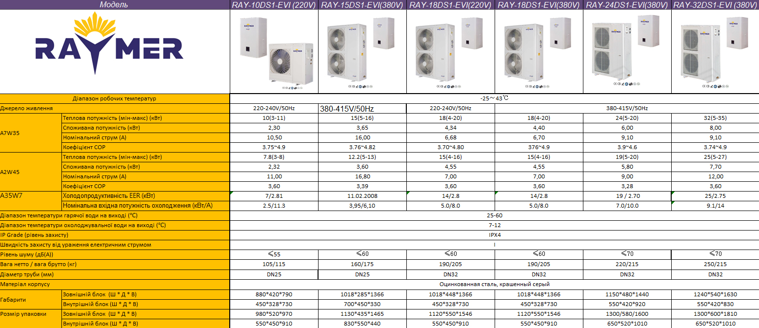 Raymer RAY-15DS1-EVI (220V або 380V) інверторний тепловий насос повітря-вода, потужність 15кВт, R410а, гарантія 5 років на компресор