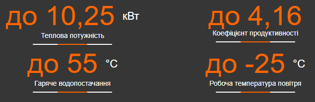 | Нагрівання води при температурі навколишнього середовища -7°C, температурі води на вході 30 °C, температурі води на виході 35 °C | ||||