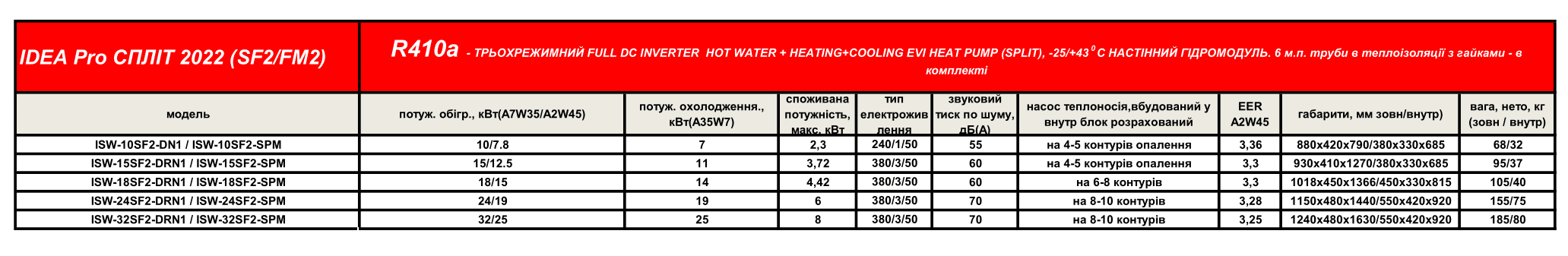 | IDEA PRO MODEL | Зовн / внутр блоки | ISW-10SF1-DN1 / ISW-10SF1-SPM | ISW-15SF1-DRN1 / ISW-15SF1-SPM | ISW-18SF1-DRN1 / ISW-18SF1-SPM | ISW-24SF1-DRN1 / ISW-24SF1-SPM | ISW-32SF1-DRN1 / ISW-32SF1-SPM |