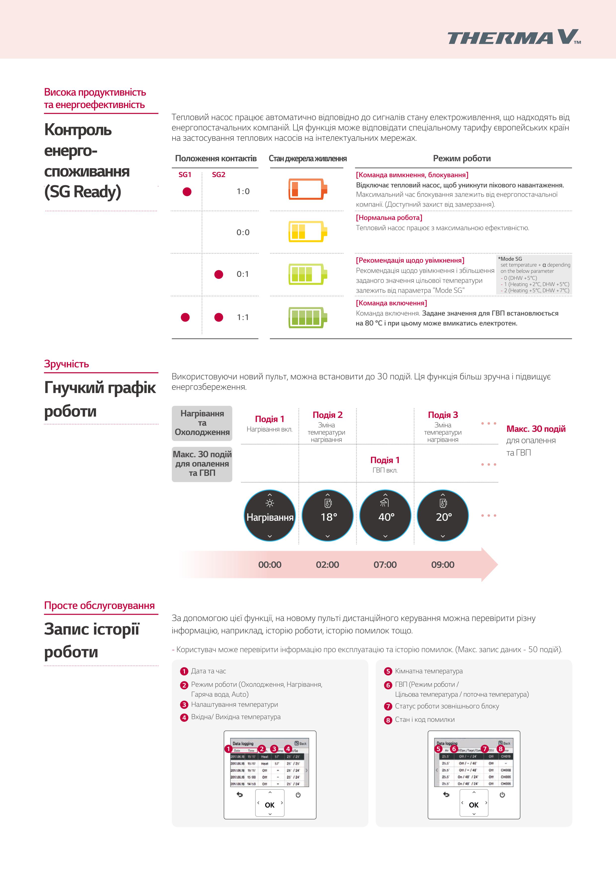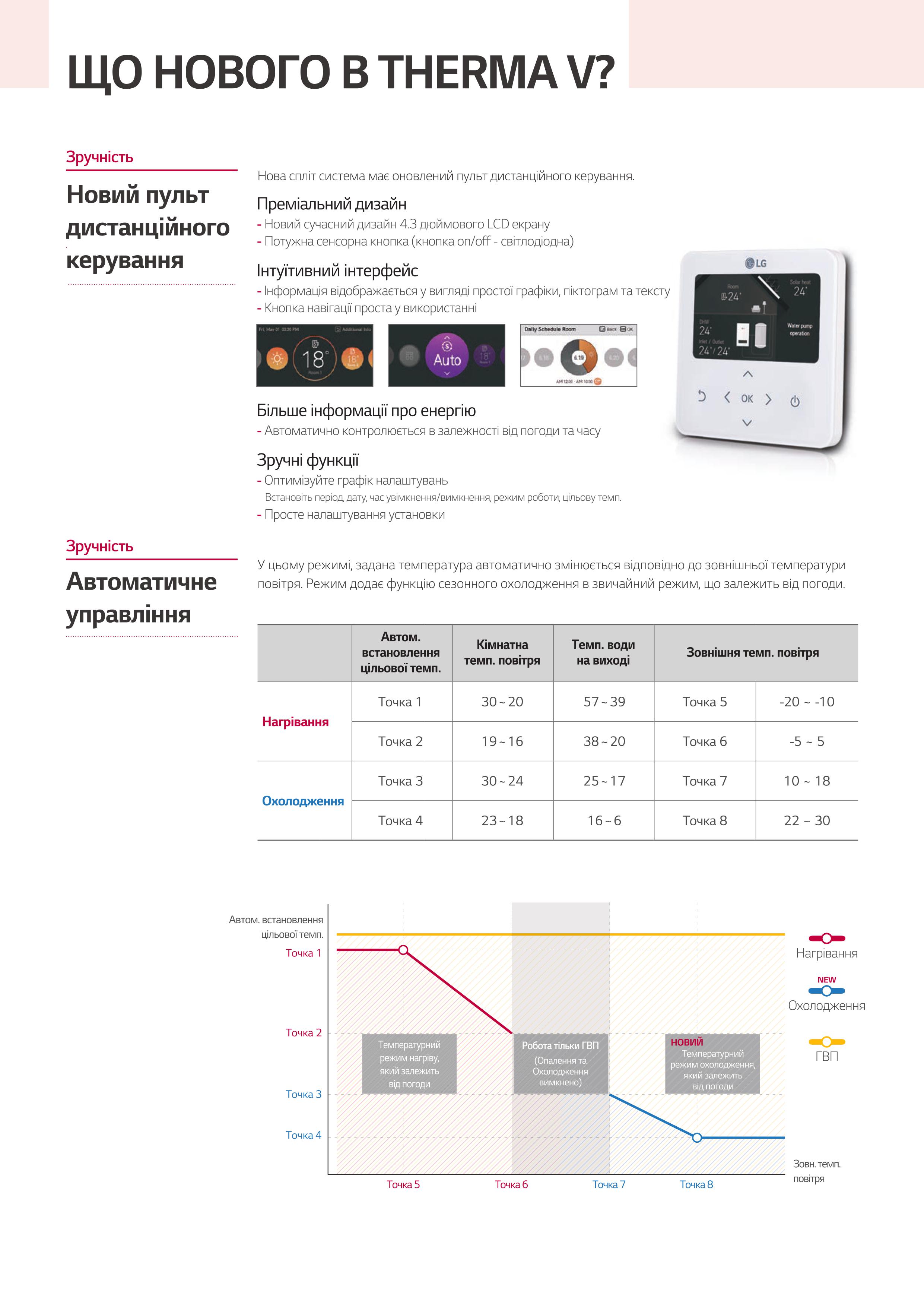 Ниже приведины основные параметры работы тепловых насосов LG Therma V воздух-вода с указанием характеристики, возможности тепловых насосов то основные функции. В любом случае тепловые насосы это оборудование, которое требует тщательного подбора и квалифицийного монтажа.