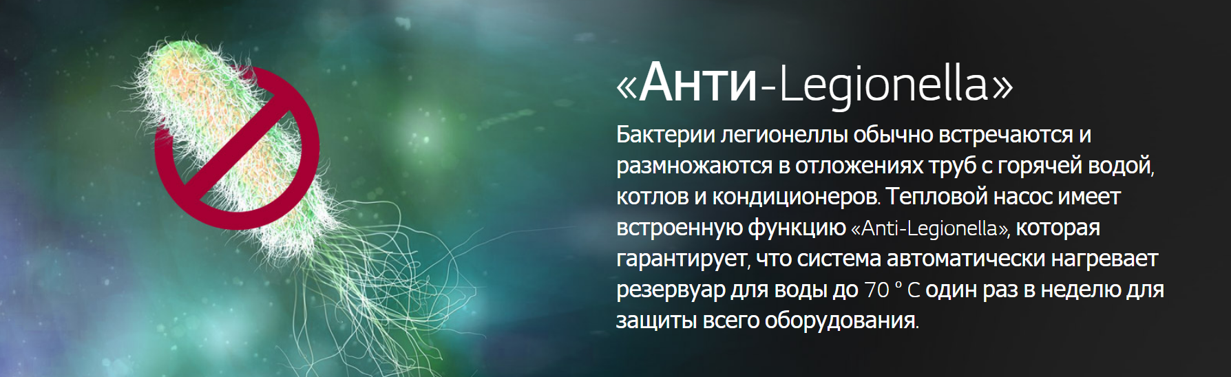 Бактерии легионеллы обычно встречаются и размножаются в отложениях труб с горячей водой, котлов и кондиционеров. Тепловой насос имеет встроенную функцию «Anti-Legionella», которая гарантирует, что система автоматически нагревает резервуар для воды до 70 ° C один раз в неделю для защиты всего оборудования.