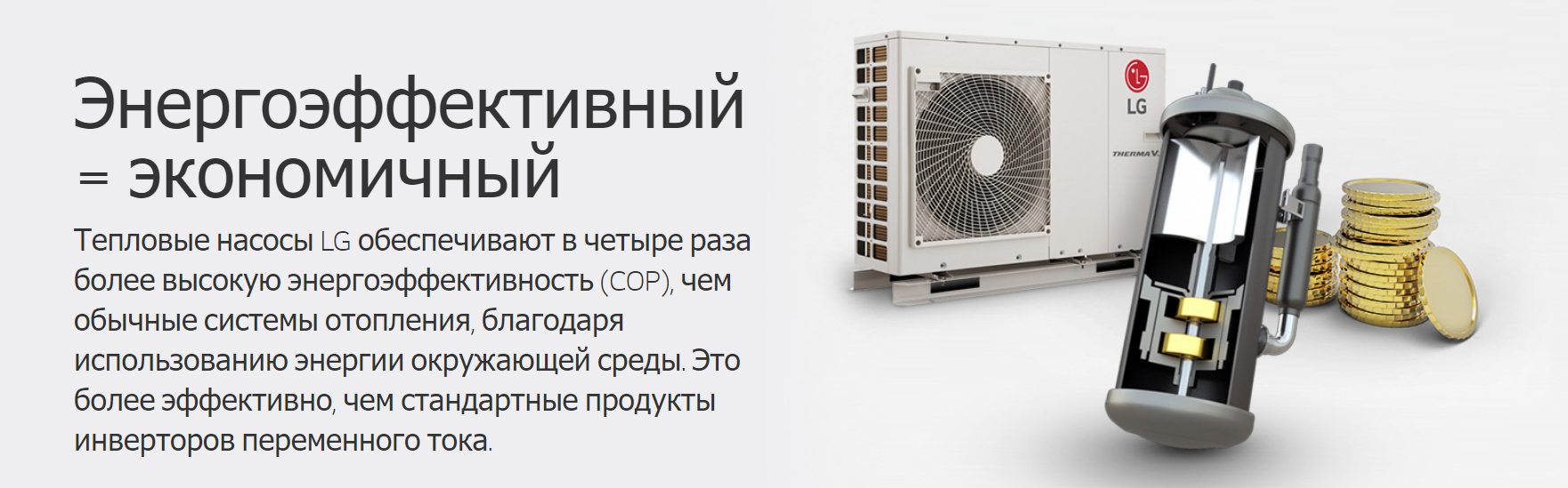 Тепловые насосы LG обеспечивают в четыре раза более высокую энергоэффективность (COP), чем обычные системы отопления, благодаря использованию энергии окружающей среды. Это более эффективно, чем стандартные продукты инверторов переменного тока.