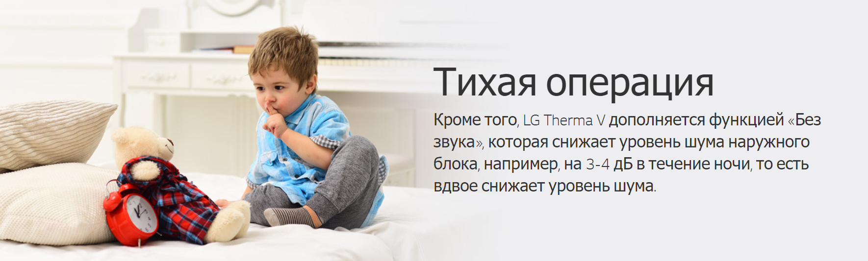 Кроме того,  LG Therma V – HN1616.NK3, HU071.U43  дополняется функцией «Без звука», которая снижает уровень шума наружного блока, например, на 3-4 дБ в течение ночи, то есть вдвое снижает уровень шума.