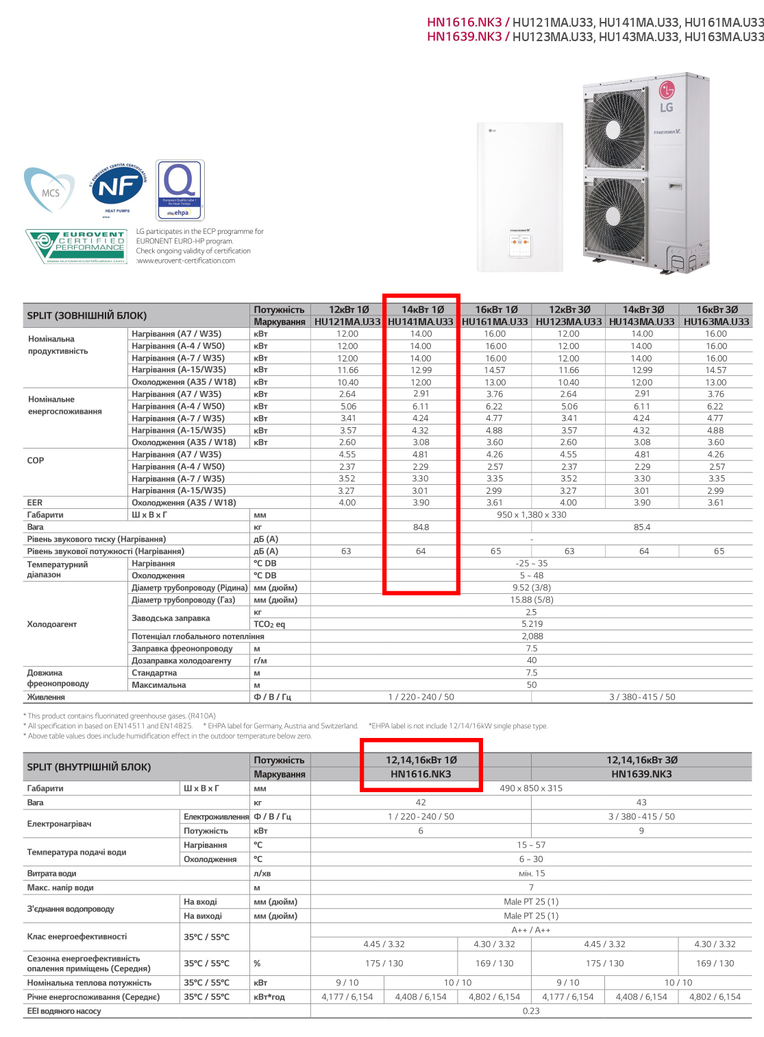 LG Therma V Series IV – HU141MA.U33 / HN1616.NK3 Инверторный тепловой насос воздух-вода 4 поколение (220 V, 1 ф) (14 кВт)