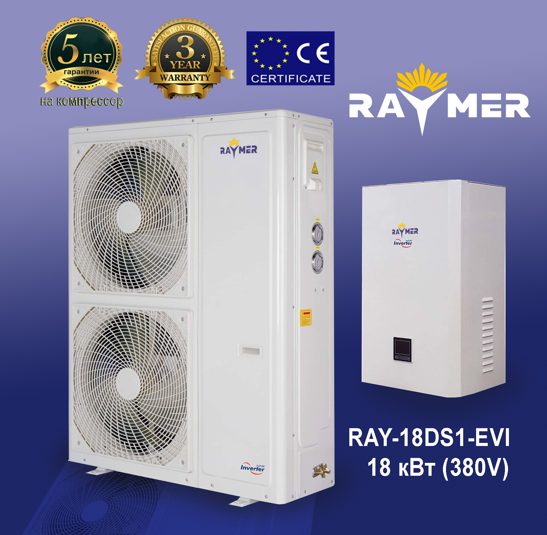Raymer RAY-18DS1-EVI (220 V или 380V) инверторный тепловой насос воздух-вода, хладагент R410a, мощность 18кВт, гарантия 5 лет на компрессор