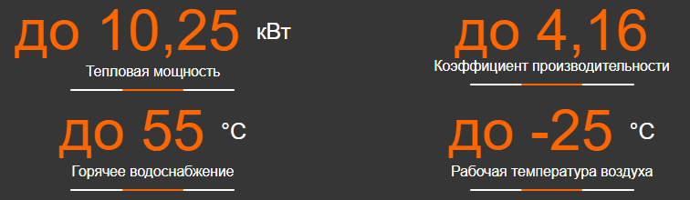 | Показатели работы в режиме обогрева, при t° окружающей среды -7℃, t° нагретой воды 35℃ |
