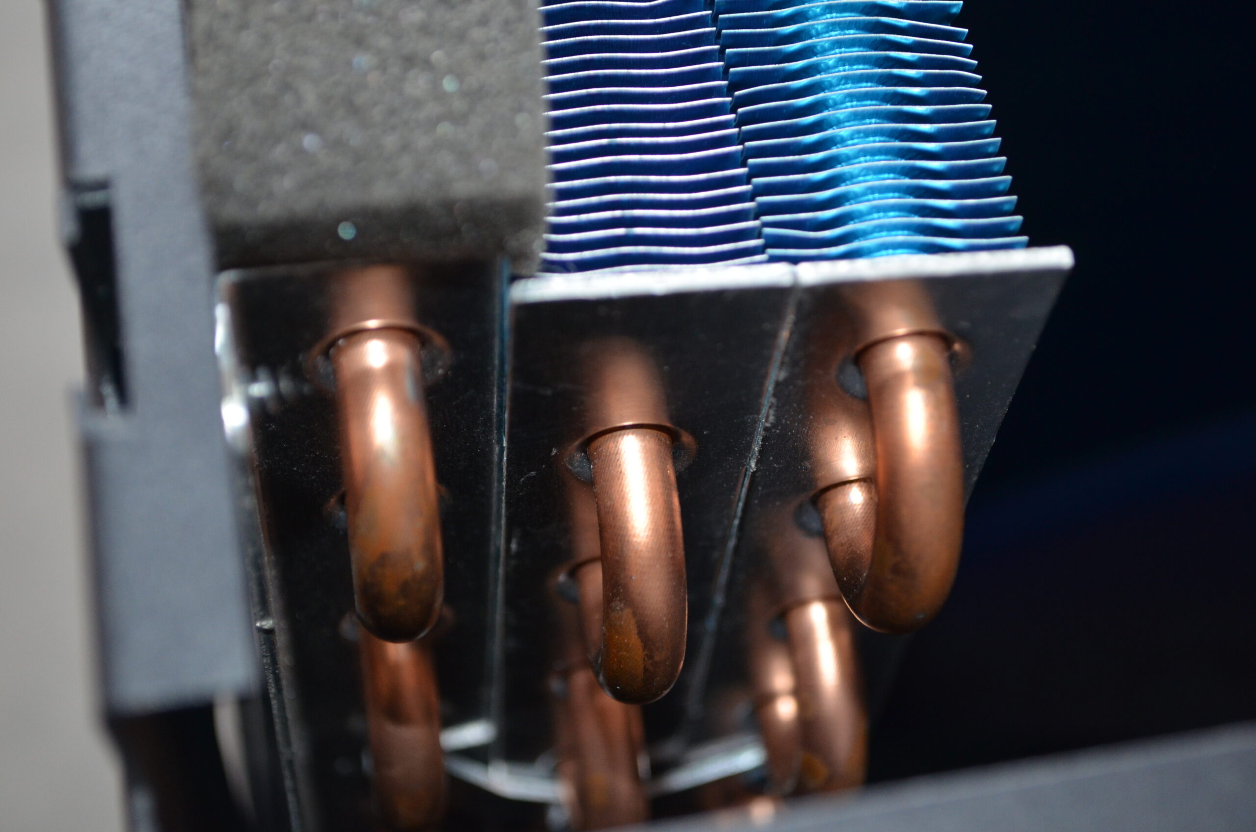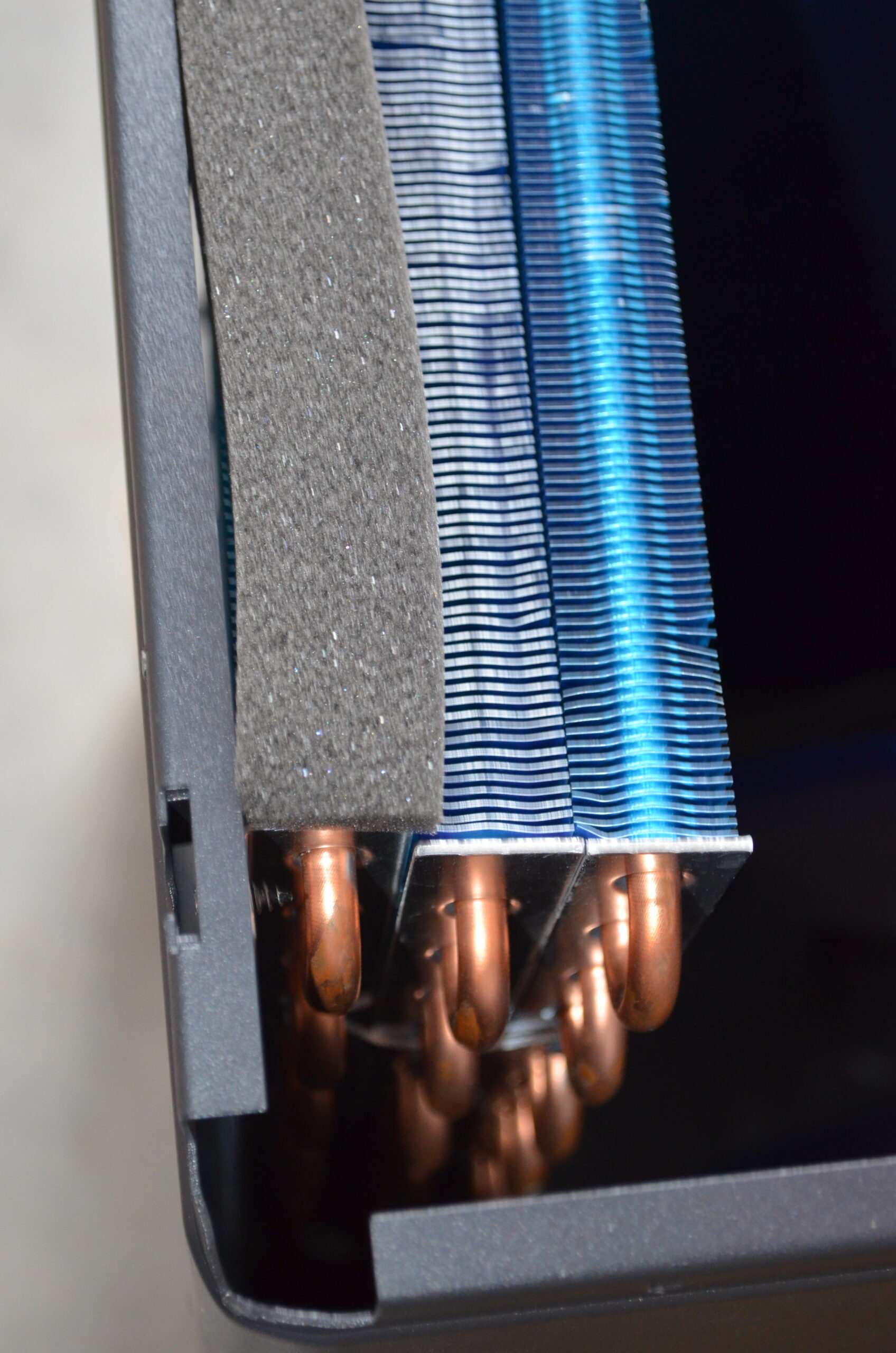 Горячий воздух после передачи тепла воздуху наружу выбрасывается через передние решетки вентиляторов.